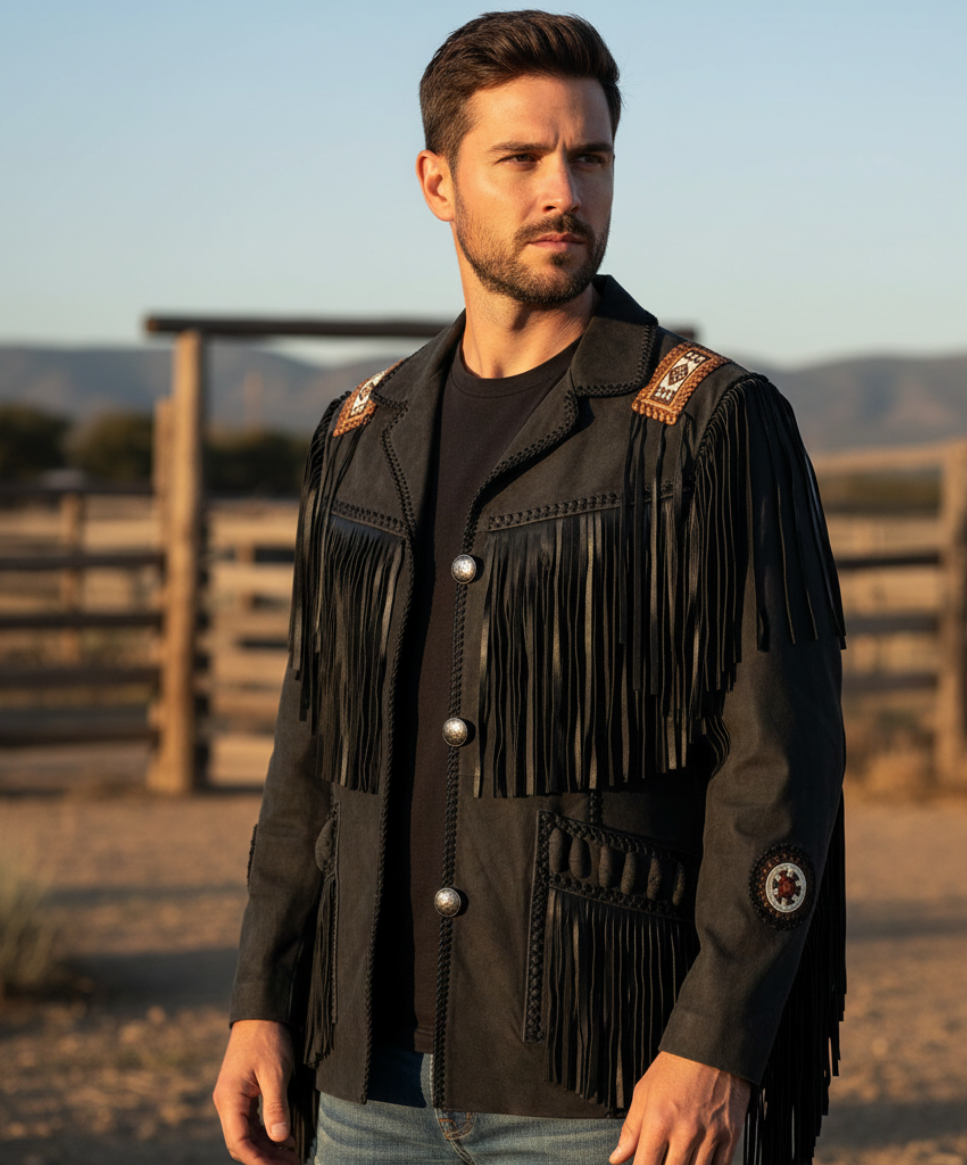 Men's Western Buckskin Suede Leather Beaded Fringes Jacket MWJ12